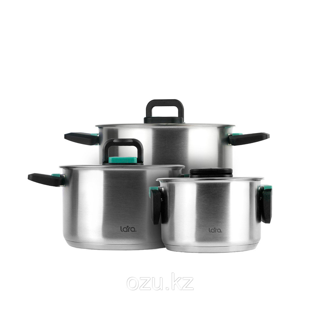 Набор посуды Lara Изумруд LR02-123 состоит из трех кастрюль с крышками подходящего диаметра. Устойчивая к окислению и появлению коррозии нержавеющая сталь не вступает в реакцию с пищевыми продуктами. Капсулированное дно толщиной 4 мм позволяет использовать посуду для готовки на разных видах плит, в том числе индукционных устройствах.